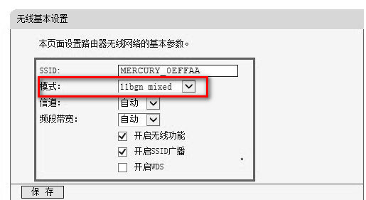 图上这个选项点开下拉菜单,选择“11bg mixed”保存;然后WMM选择关闭(或取消勾选,找不到请点击左侧“无线高级设置”)