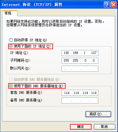 选择“使用下面的IP地址”,“使用下面的DNS服务器地址”,将下图中的IP地址,子网掩码,默认网关填写到您的电脑上,"确定"即可